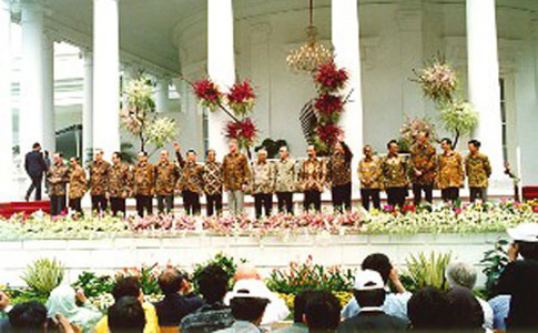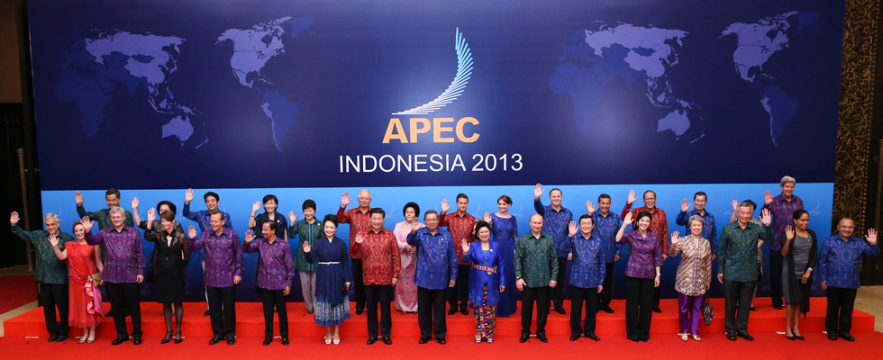 2013年10月,印度尼西亚巴厘岛会,第21次APEC峰会 东道主印尼总统苏西洛晚上在努沙杜阿会议中心为与会的APEC领导人夫妇举行欢迎晚宴。而在晚宴开始前,他们按照传统,穿上印尼的民族服装“安代克”拍摄大合照。