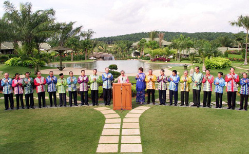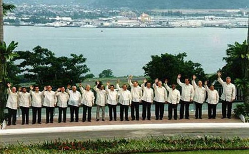 2000年11月,文莱斯里巴加湾,第8次APEC峰会 各领导人穿的是一种叫“MIB”的衬衫,因为它最具文莱特色。这是一种类似中国市场上到处可见的那种竖领衬衫,文莱人出席重要仪式一般都穿着它。颜色一般是白、蓝等单一色。