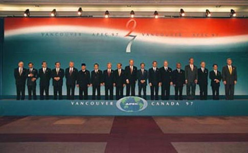 1993年11月,美国西雅图,首次APEC峰会 会议一开始就决定以非正式的形式进行:不设主题,领导人不带助手,自由交谈。当时,克林顿总统就穿着牛仔裤,颇具特色。