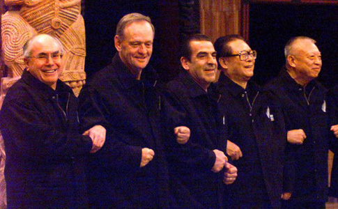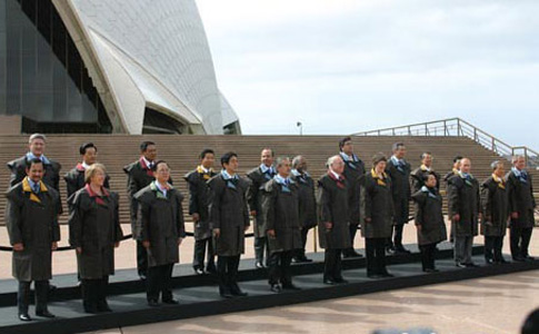 2007年9月,澳大利亚悉尼,第15次APEC峰会 各领袖会穿什么“民族服装”,主办方一直保持高度神秘。直到各国领袖在世界媒体前亮相之时才揭晓:原来澳洲选择了深褐色的皮夹克,样子很容易使人联想到厚重的雨衣。