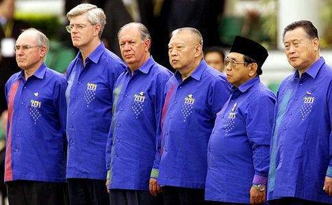 1994年11月,印尼茂物,第2次APEC峰会 时任印尼总统苏哈托量体裁衣,为每位领导人送了一件BATTIK(一种蜡染印尼衬衣),花色各异。此后,会议主办国都依此惯例,延续至今。