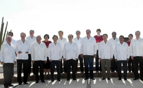 2002年10月,墨西哥洛斯卡沃斯,第10次APEC峰会 各领袖的服装是墨西哥东南沿海地区印第安人爱穿的一种当地叫“瓜亚贝拉”的白衬衫。“瓜亚贝拉”为小翻领,四个贴兜,胸前衣襟上绣有花纹,长袖,多为浅色。