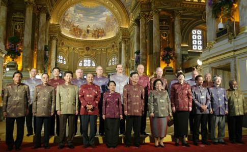 2003年10月,泰国曼谷,第11次APEC峰会 出席会议的各成员领导人身着泰国民族服装集体合影,每件服装的价格2700美元。这种织入金线的丝绸显示了泰国丝织行业最高超的技术,一直是皇室的专属服装,直到20世纪才允许平民穿着。