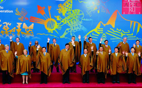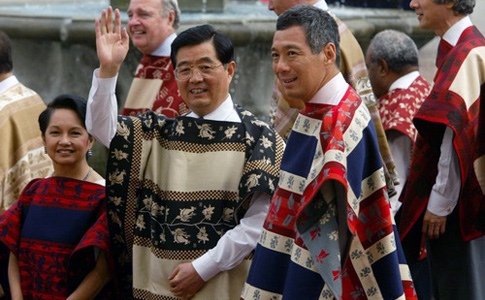 2008年11月,秘鲁利马,第16次APEC峰会 “彭丘”(poncho,西班牙语,音译,意为“披风、斗篷”),是用羊驼毛织成的披风,形状像长方形的毛毯,两侧的下摆有灰黑相间的传统花边,是秘鲁安第斯山区印地安人的传统服装。