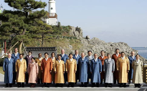 2005年11月,韩国釜山,第13次APEC峰会 韩式大褂“图鲁马吉”被选定为APEC会议的领导人服装。21个成员领导人和代表聚会时身着“图鲁马吉”。 外套有七种不同的颜色,服装上的图案在古老的东方文化中象征着长寿、永久等。