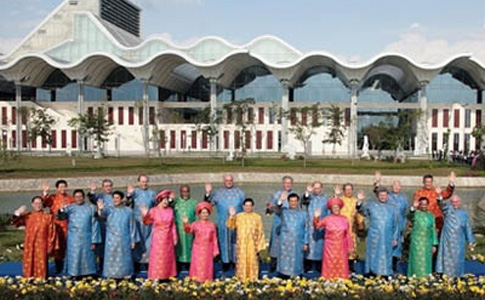 2006年11月,越南河内,第14次APEC峰会 各国领导人身穿越南的一种丝质长衫“奥黛”亮相。此次峰会礼服有5种颜色,由越南最知名的服装设计师明汉设计,并请25名裁缝花了好几个月时间缝制。
