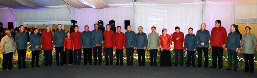 2009年11月,新加坡,第17次APEC峰会 本届峰会提前公布了与会领导人拍“全家福”将穿的服装。服装是由新加坡籍服装设计师宋伟杰设计的,旨在展示新加坡的多元种族和文化。男装分为绿、红、灰三种颜色,面料为亚麻,服装的绣花和扣子都采用了典雅的荷花造型;女装则为红色丝绸面料,整体设计简洁而现代,同时还体现了东南亚浓郁的民族风情。