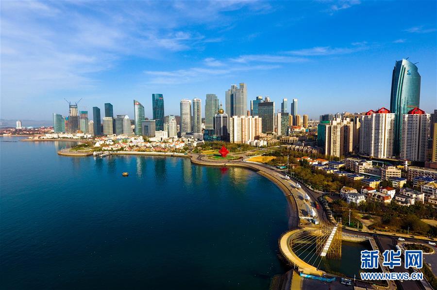 青岛五四广场及其周边景色(4月16日无人机拍摄)。/