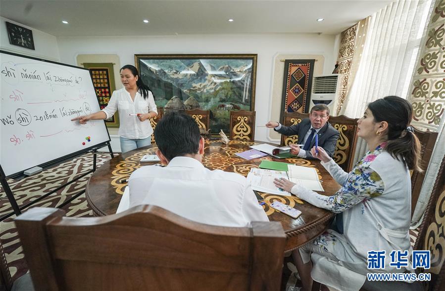 5月8日,上海合作组织秘书处的工作人员在学习中文。/