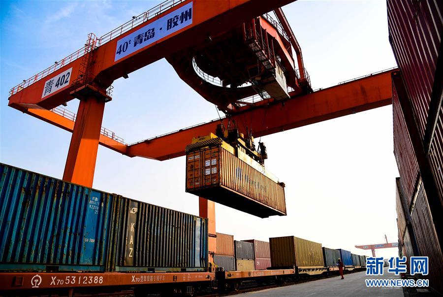 在青岛胶州湾国际物流园,龙门塔吊在往中亚班列上装载货物(5月7日摄)。/