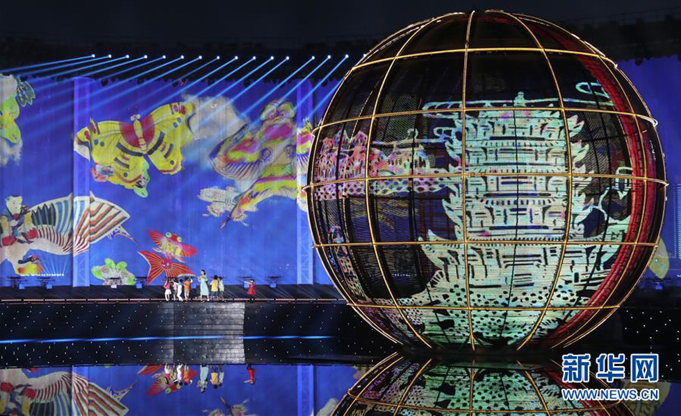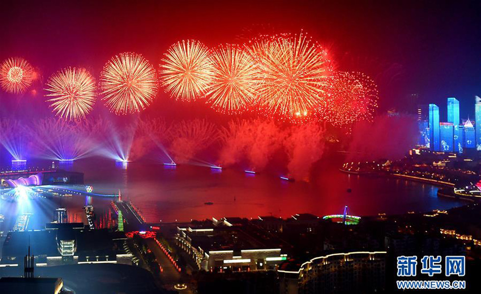 这是9日晚在青岛举行的《有朋自远方来》灯光焰火艺术表演。