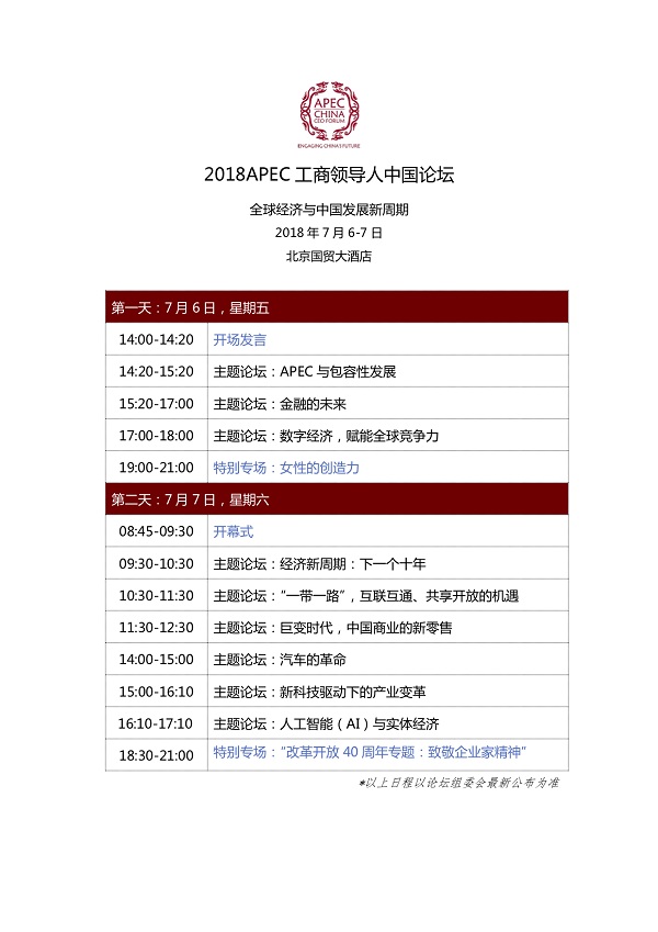 2018APEC工商领导人中国论坛在京启幕 人民网北京7月6日电 (徐祥丽 温庆)2018APEC工商领导人中国论坛今日在京启幕。本届论坛由中国国际贸易促进委员会、中国国际商会、 APEC中国工商理事会主办, 以“全球经济与中国发展新周期” 为主题,旨在汇聚全球工商领袖与经济学家,助力工商界把握历史发展机遇,展示新时代中国的全球担当。