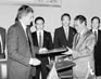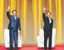 图为朝鲜副外长姜锡柱(右)与美国首席谈判代表加卢奇交换协议文本。