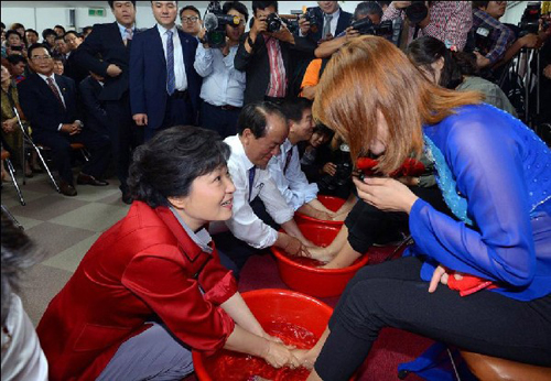 为显示亲民风范,当地时间2012年10月4日,朴槿惠在“洗足”仪式上为一名女子洗脚,该活动旨在提高为国民服务的意识。新华社发