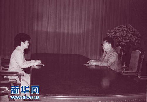 这是2002年朴槿惠访问朝鲜时,与金正日会谈的资料照片。 新华社/纽西斯通讯社