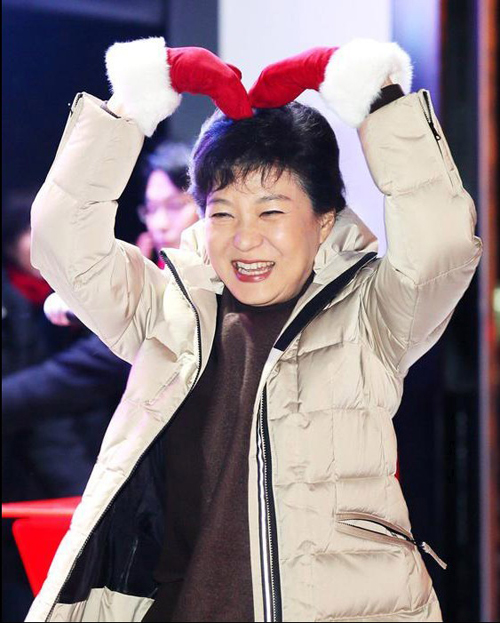 当地时间2012年11月29日,韩国仁川,总统候选人朴槿恵做心形造型。新华社发