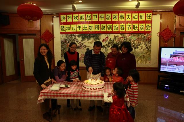 驻芝加哥总领事赵卫平为过生日馆员切蛋糕