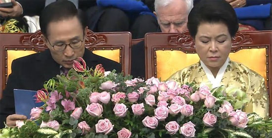 李明博夫妇在现场(图片来自韩国媒体视频截图)