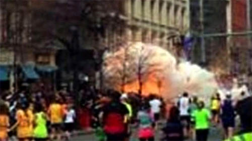 爆炸是在马拉松冠军越过终点后两个小时发生的。第一起爆炸后数秒钟又发生第二起爆炸。这是现场爆炸后的烟雾。