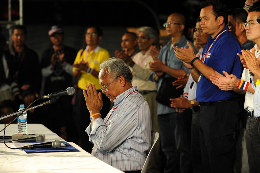 1月13日,泰国反对派的支持者在曼谷商业中心的“世贸百货”商场附近参加集会。当日,泰国反对派“人民民主改革委员会”启动筹备多日的“封城”行动,锁定首都曼谷的8处建筑和7处路口为主要目标,试图继续以街头政治的方式推翻政府。(新华社记者高健钧摄)