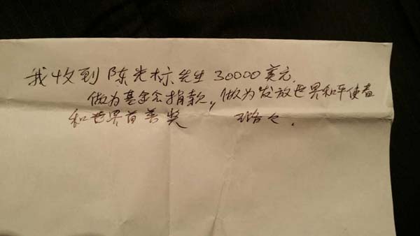 陈光标出示的自称中国全球合作基金会执行董事周璐璐收据。收据中写道:“我收到陈光标先生30000美元,作为基金会捐款,作为发放世界和平使者和世界首善奖”,落款为“璐璐”。