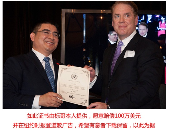 陈光标的证书上有中英文的“联合国”大字,在上面的签名叫唐纳修。唐纳修在网上的自我介绍说是瑞士银行的高级副总裁,基金会应该是他的兼职。人民网驻美记者打通了他在纽约的电话,但他说不接受媒体采访。
