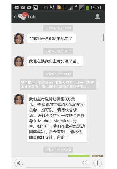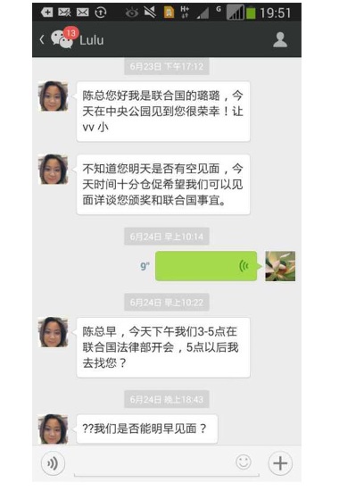 针对中国全球合作基金会称“首善证书”是陈光标自己提供的,7月9日,陈光标发表长微博予以否认,并公布了周璐璐与他的微信聊天记录。聊天记录显示,周璐璐最先与陈光标联系,称自己是联合国的,如果陈光标捐助3万美元,将邀请他“正式加入我们的委员会”。