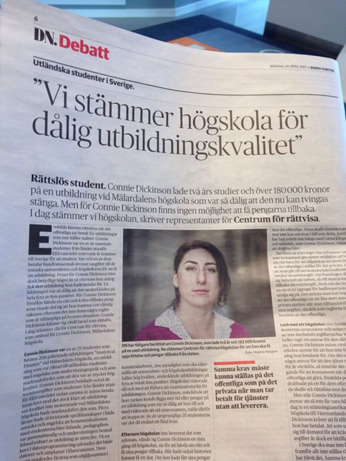 消息称,美国女学生珂妮迪克森2011年来到瑞典美拉达伦大学就读针对外国学生的英语授课金融分析专业。从2011年开始,瑞典大学开始对非欧盟国家学生实行收费政策,因此珂妮迪克森向学校缴纳了约十八万克朗的学费。但是,教学质量远远达不到学校之前所做的承诺。