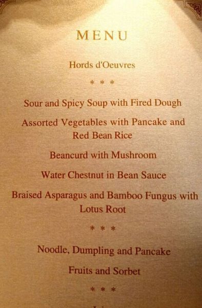 这顿国宴可以说结合了中印特色,第一道菜既有西安特色的酸辣汤、又融合印度烤面团(称为帕地)的吃法。西安土特产荸荠也是主菜的材料。第二道菜什锦蔬菜煎饼和红豆饭,然后还有蘑菇豆腐汤、豆瓣荸荠、红烧芦笋和竹荪炒莲藕。主食和甜点还有面条、水饺、薄煎饼和水果冰沙。