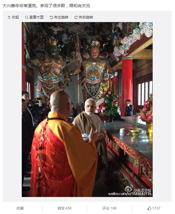 莫迪随后也在微博上表示:“大兴善寺非常漂亮。参观了很多殿,跟和尚交流”。