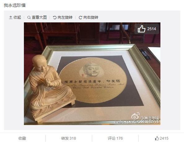 岳钰说,菩提树在佛教和印度教中都是圣树。释迦牟尼当年就是在菩提树下悟出了佛教超然“四苦”以解脱烦恼的方法,因此菩提树的意义已经超出了它自身的存在。而对于这份礼物,莫迪也不忘在微博上“秀”了一把,并留言道“我永远珍惜”。
