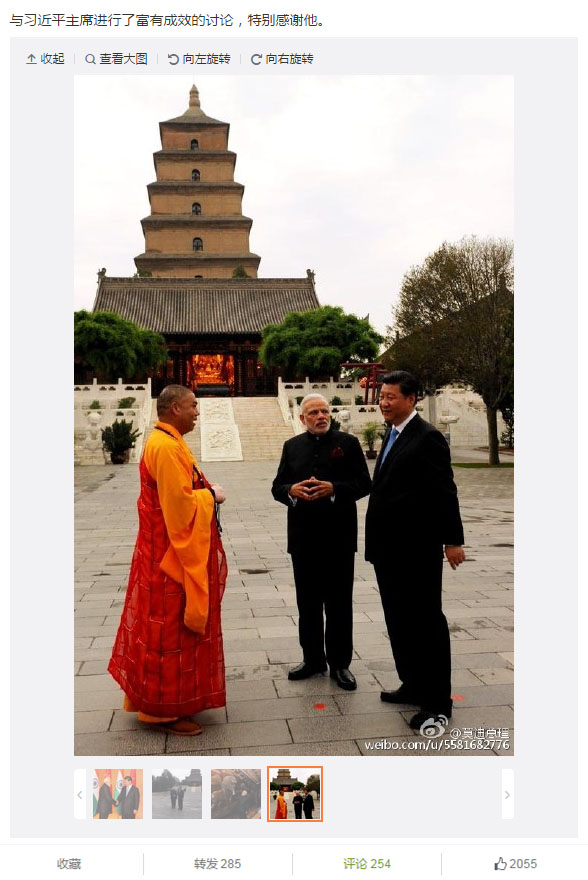 此间有观察人士称,佛教作为中印两大文明相互交往的结晶高峰,莫迪此访展开“佛教外交”非常重要。印度媒体5日撰文表示,印度“向东看”战略的实施,需要佛教这座天然联系东亚及东南亚国家的桥梁。值得注意的是,莫迪曾表示自己执政以来历次出访几乎离不开“拜庙”,无论是此前的日本、斯里兰卡之旅,还是这次的中国之行,都把参观当地著名寺庙列入重要日程。此次到西安,莫迪与习近平在大雁塔会面,印度民众也会藉此了解唐僧取经、唐朝盛事等中国历史文化中不可或缺的亮点。