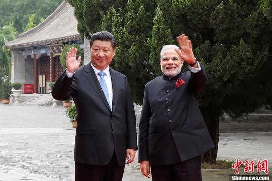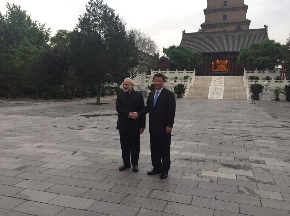 14日下午,身穿印度传统服饰的莫迪步入大慈恩寺山门,中国国家主席习近平在此迎候。两国领导人握手寒暄,亲切互动。两国领导人先后参观了大雄宝殿、大雁塔、玄奘三藏院。