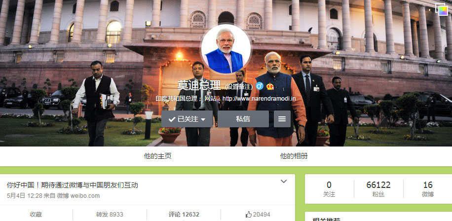 而早在5月4日,莫迪就开通了自己的官方微博,并发出首条微博对中国人民进行问候,“你好中国!期待通过微博与中国朋友们互动。”他也成为第五位开通微博的外国领导人,在正式访华之前就在中国展开了他的“微博外交”。