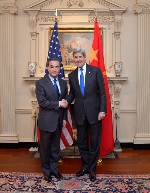 当地时间2月23日,外交部长王毅在华盛顿同美国国务卿克里举行会谈。