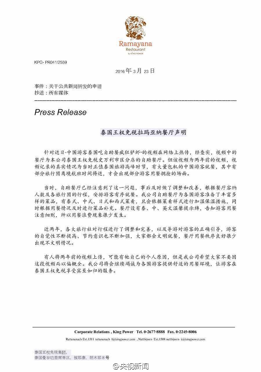 泰国王权免税店3月23日发声明,证实“中国游客疯狂铲虾”视频拍摄地为该公司自助餐厅,但为两年前视频。当时正值泰国旅游高峰,有大量包机的中国游客就餐,部分旅行团离境航班时间将近才出现拥抢场面。已对餐厅调整改善,近两年用餐秩序良好,很少出现不文明情况。