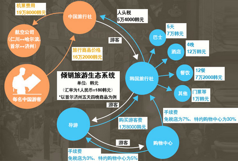 中国旅行社是甲方,只需要从大批争着抢夺中国游客的韩国旅行社中选择一家愿意支付较高人头税的公司转介游客即可从中获利。在此过程中,部分“黄金商品(购物收益可能较高的旅游团)”的人头税甚至高达700元人民币(约合126000韩元)。韩国业界的竞争使中国旅行社得以轻松坐收渔利。哈尔滨的发团旅行社在1200元人民币整体收入(商品价格+人头税)中抽出100元人民币手续费,拿剩余的1100元支付机票价格。