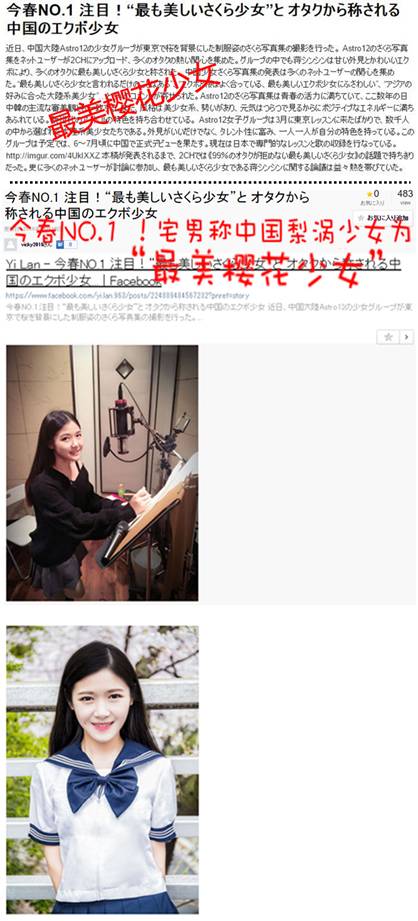 中国女子偶像组合Astro12在东京拍摄的一组樱花写真被日本网友传到社交媒体2CH论坛上,引起了日本网友的热烈讨论,组合成员蒋晨晨更是被日本宅男评价为“最美樱花少女”。