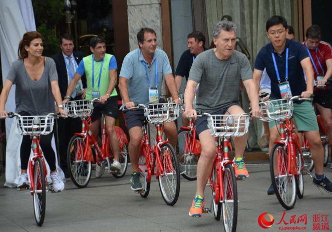 9月5日清晨,正在参加G20峰会的阿根廷总统马克里(前)与夫人(左一)从驻地酒店一出来,便骑上杭州的公共自行车游览了西湖美景。 王婕、包卫丽 摄