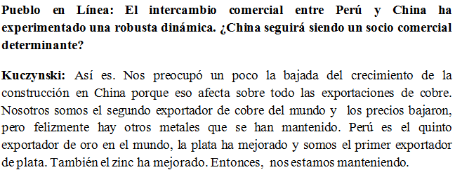 库琴斯基:当然是。我们对中国经济建设增速的放缓略表担忧,因为这影响了秘鲁产品尤其是铜矿的出口。秘鲁是世界第二大铜矿出口国,铜矿价格不断下降,比较幸运的是,有其他金属在支撑整个矿业。秘鲁还是世界第五大黄金出口国和第一大白银出口国,锌的出口也有所提升,所以秘鲁整个矿业基本还是维持着平衡。