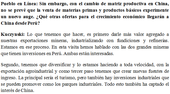 库琴斯基:我们首先需要做的就是,提高矿业出口产品的附加价值,实现铸造业和炼油的工业化生产。访问期间,我们已经和两大中国矿产企业交流,他们都表示对投资秘鲁很感兴趣。