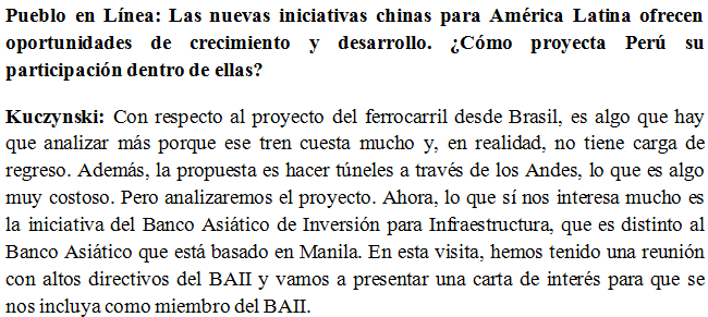 库琴斯基:对于两洋铁路项目,我认为还得要做更多深入的分析,穿凿安第斯山脉修建隧道,花费相当庞大。实际上,回程列车将是空载的(也就是说没有这么多的巴西产品输入到秘鲁)。对此我们还将做更多的分析。现在我们非常感兴趣的是亚投行的倡议,这有别于亚洲开发银行。访问期间我们和亚投行的高管举行了会谈,我们将递交意愿书,希望加入亚投行。