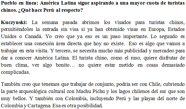 库琴斯基:上个星期我们向中国游客开放了签证,允许持有欧洲、美国和加拿大签证的中国游客进行有条件免签进入秘鲁,这是跨出的重要一步。另外,就是开通直航,这也是我们这次访华所要协商的一方面。第三,我们要进行更多的宣传和营销,让中国游客更加了解拉美。
