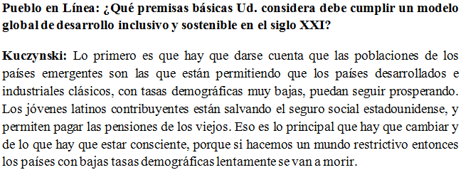 库琴斯基:首先需要意识到的是,新兴经济体国家是允许人口增长率很低的发达国家和工业国家继续繁荣发展的。实际上拉美国家的年轻移民是在拯救美国的社会保障,是他们的纳税在保障老年人的养老金。这才是最需要改变也最需要引起人们注意的主要方面,如果将人们都禁锢于各个国家内,那些低人口增长率的发达国家将会消亡殆尽。