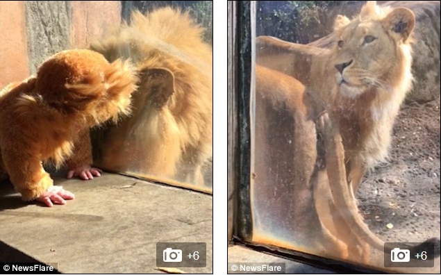 萌化!狮子与穿幼狮装宝宝隔窗击掌【3】