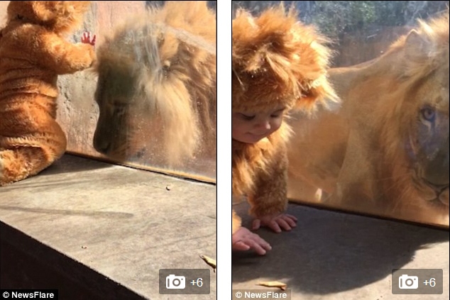 萌化!狮子与穿幼狮装宝宝隔窗击掌【4】