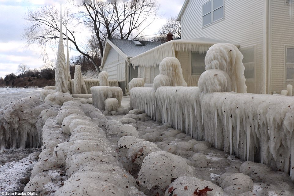 严寒气流:Webster湖岸边的植物完全被的厚厚冰层所吞噬。其他有人居住的房子的境遇要比Kucko家好很多,因为他家的房子在冰层堆积时没有人在。