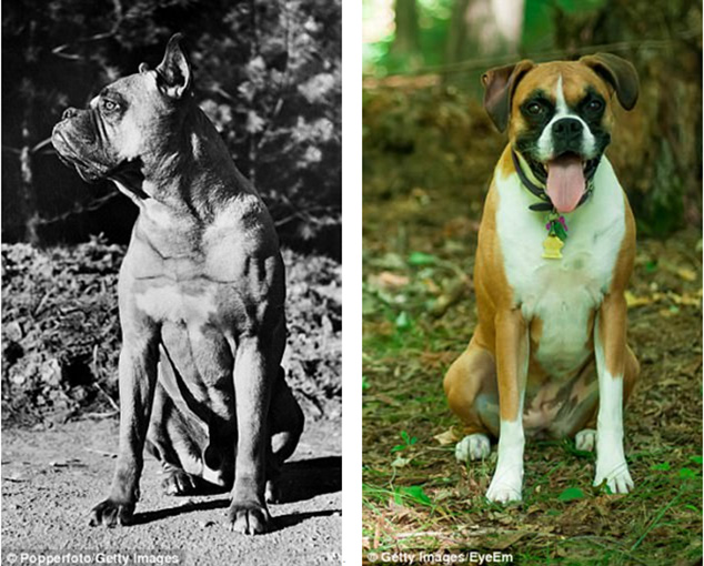 在变成工作犬之前,拳师犬的脸更长,尾巴更长且向下垂:20世纪40年代的拳师犬(左图)和今天的拳师犬(右图)