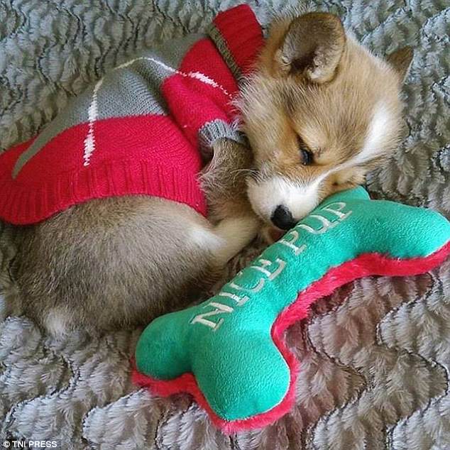 这只小狗穿着套头针织衫,蜷曲在它的毛绒玩具里,睡得真香甜