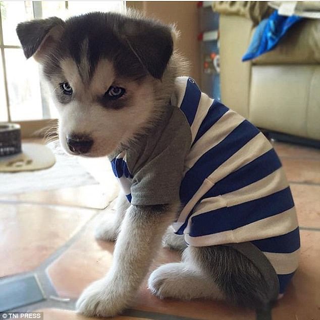 这只哈士奇似乎已经穿好睡衣准备睡觉了,但是主人还要拍照,闹情绪了